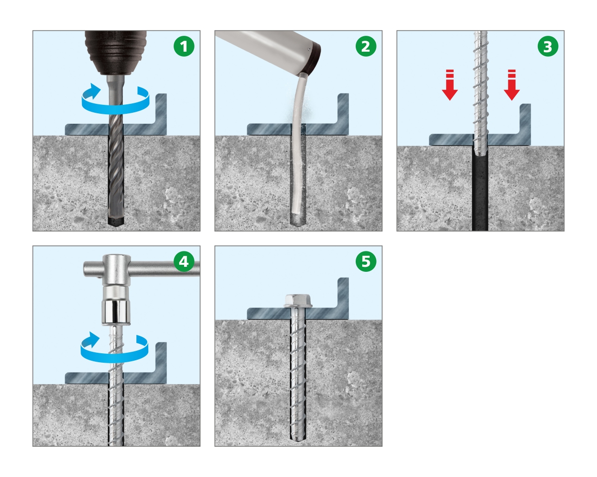 Анкер-шуруп - это упорный анкер, распорная зона которого представляет собой самонарезающую резьбу достаточной прочности для нарезания ответной резьбы в бетонном или каменном строительном основании.В отличие от механического или химического анкера работает за счет геометрии резьбы и не создает давление на материал.Резьба врезается в бетон.Ключевые преимущества:1) Лёгкость монтажа за счёт конструкции;2) Нагрузка сразу после монтажа;3) Высокая надёжность узла крепления и высокие показатели на вырыв;4) Сниженные краевые и осевые расстояния между анкерами. Не создает напряжение в материале;5) Нет "торчащей" резьбы;6) Возможность демонтажа и повторного использования.