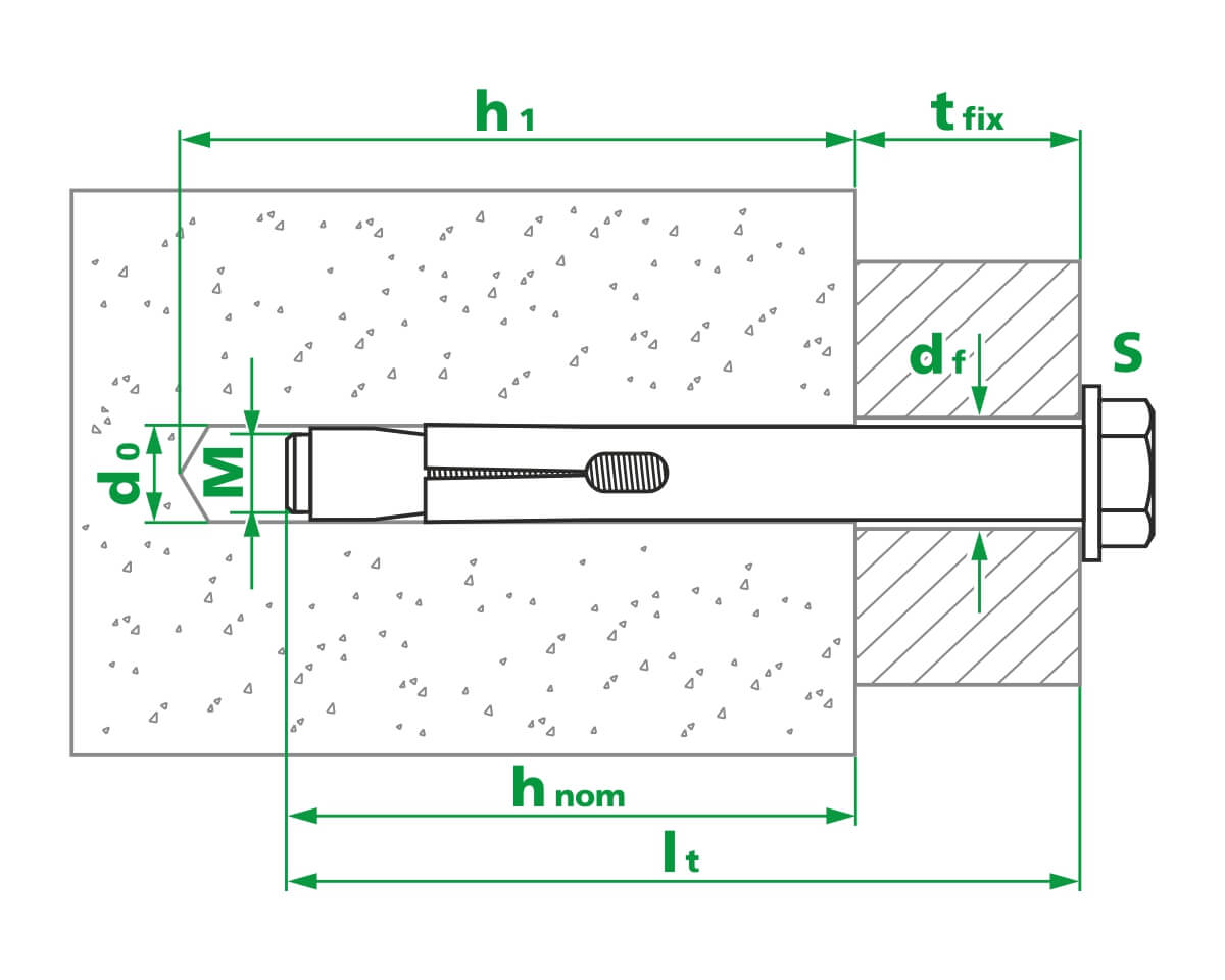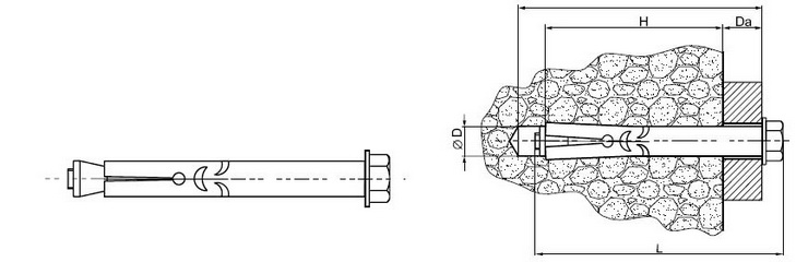 Анкерный болт используется для крепления тяжеловесных конструкций к полнотелому бетону, природному строительному камню, полнотелому кирпичу.Может применяться для крепления к тонким бетонным перегородкам.Изготовлен из стали, поверхность оцинкована и пассирована.Особенности конструкции:• Болт с резьбой и конусообразной гайкой.• Цилиндрическая подвижная муфта с продольными прорезями и шайбой.• Головка шестигранная.Принцип работы: при завинчивании болта конусообразная гайка втягивается в муфту и происходит распирание. Причем крепление идет вдоль всей муфты за счет ее дополнительной деформации у основания анкера.Монтаж:1. Просверлите отверстие в несущей основе по размерам, указанным изготовителем и очистить его.2. Вставьте анкер с навешенной на него монтируемой деталью в отверстие, забить легкими ударами молотка до упора.3. После этого затяните гайку на 3-5 оборотов.Анкерный болт — незаменимым инструментом при установке тяжеловесных конструкций с минимальными усилиями и максимальной безопасностью.