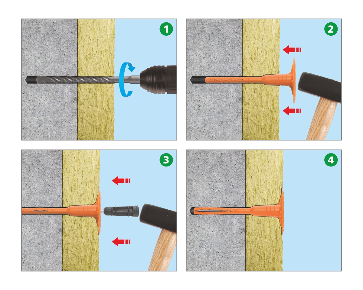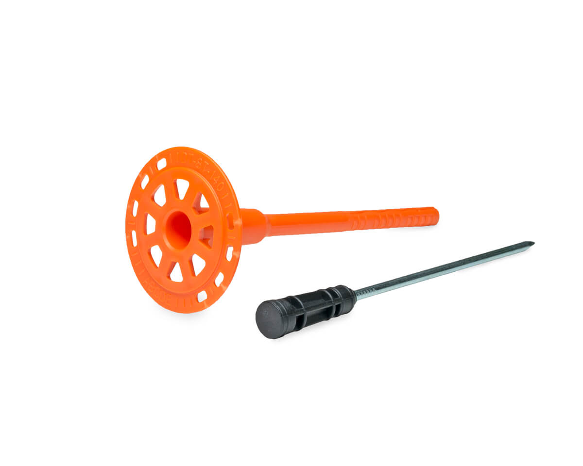 Назначение: для крепления теплоизоляционных материалов в бетон, полнотелый кирпич, пустотелый керамический кирпич, газосиликат и керамзитобетон.Свойства: крепежная система состоит из распорного дюбеля диаметром 8 мм с удерживающим диском диаметром 60мм. Комплектуется гвоздем из оцинкованной стали с высокоэффективной термоголовкой. 1) Высокоэффективная термоголовка. Снижает теплопотери. До 6 раз эффективнее стандартных дюбелей;2) Уникальная конструкция распорной зоны. Обеспечивает монтаж в любой стеновой материал с нагрузкой на вырыв до 200 кг;3) Видимая маркировка. Позволяет определить размер в смонтированном состоянии;4) Рёбра жесткости. Выдерживают нагрузку утеплителя до 250 кг;5) Перфорированная шляпка. Гарантирует надежность сцепления штукатурного слоя с теплоизоляцией. Материал изготовления:Дюбель изготовлен из полипропилена, гвоздь - из оцинкованной стали, термоголовка - из нейлона.