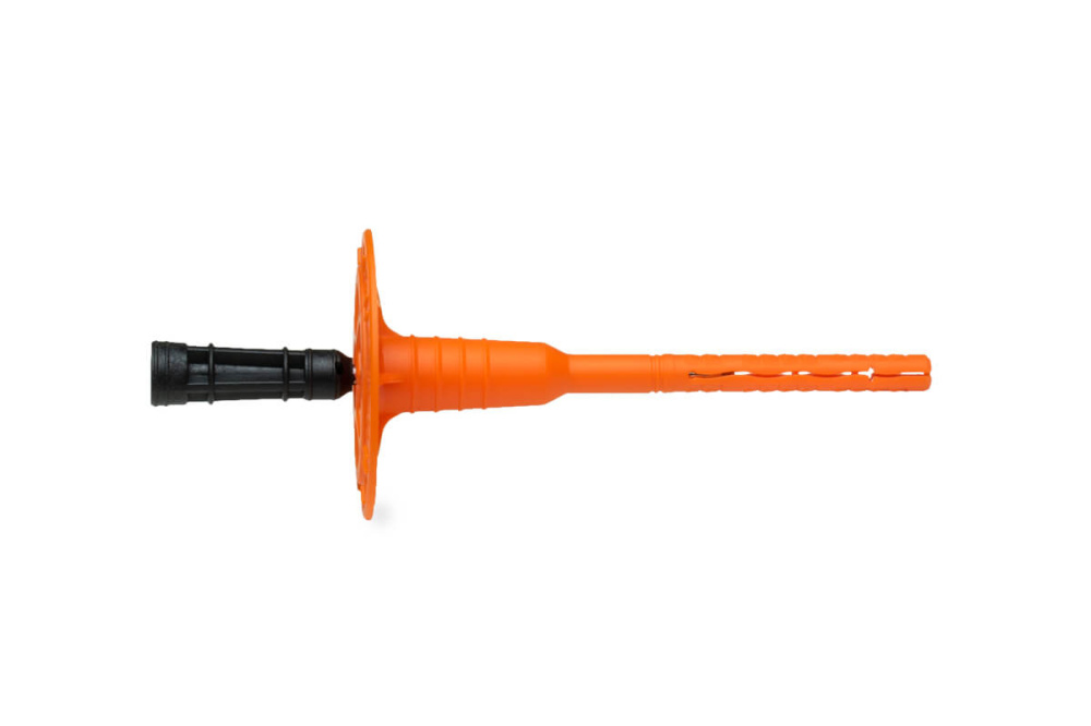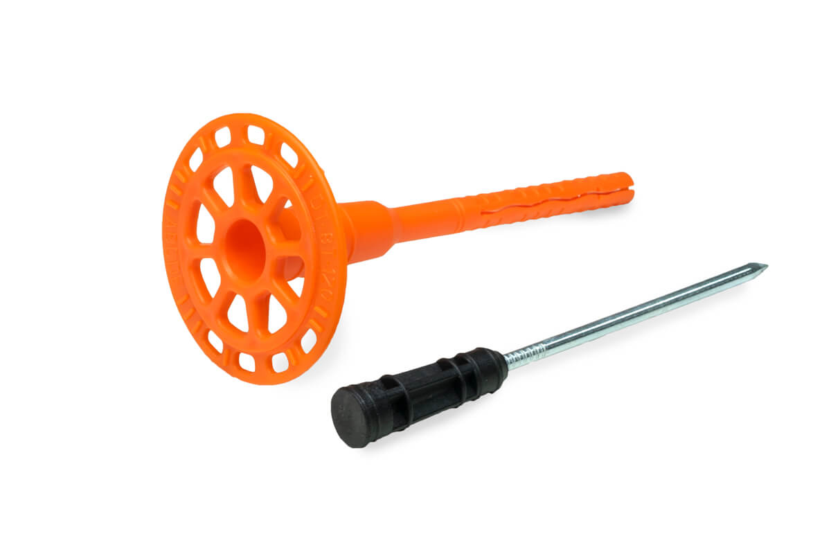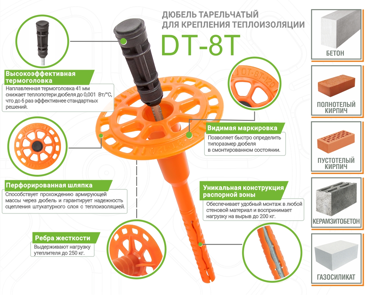 Назначение: для крепления теплоизоляционных материалов в бетон, полнотелый кирпич, пустотелый керамический кирпич, газосиликат и керамзитобетон.Свойства: крепежная система состоит из распорного дюбеля диаметром 8 мм с удерживающим диском диаметром 60мм. Комплектуется гвоздем из оцинкованной стали с высокоэффективной термоголовкой. 1) Высокоэффективная термоголовка. Снижает теплопотери. До 6 раз эффективнее стандартных дюбелей;2) Уникальная конструкция распорной зоны. Обеспечивает монтаж в любой стеновой материал с нагрузкой на вырыв до 200 кг;3) Видимая маркировка. Позволяет определить размер в смонтированном состоянии;4) Рёбра жесткости. Выдерживают нагрузку утеплителя до 250 кг;5) Перфорированная шляпка. Гарантирует надежность сцепления штукатурного слоя с теплоизоляцией. Материал изготовления:Дюбель изготовлен из полипропилена, гвоздь - из оцинкованной стали, термоголовка - из нейлона.
