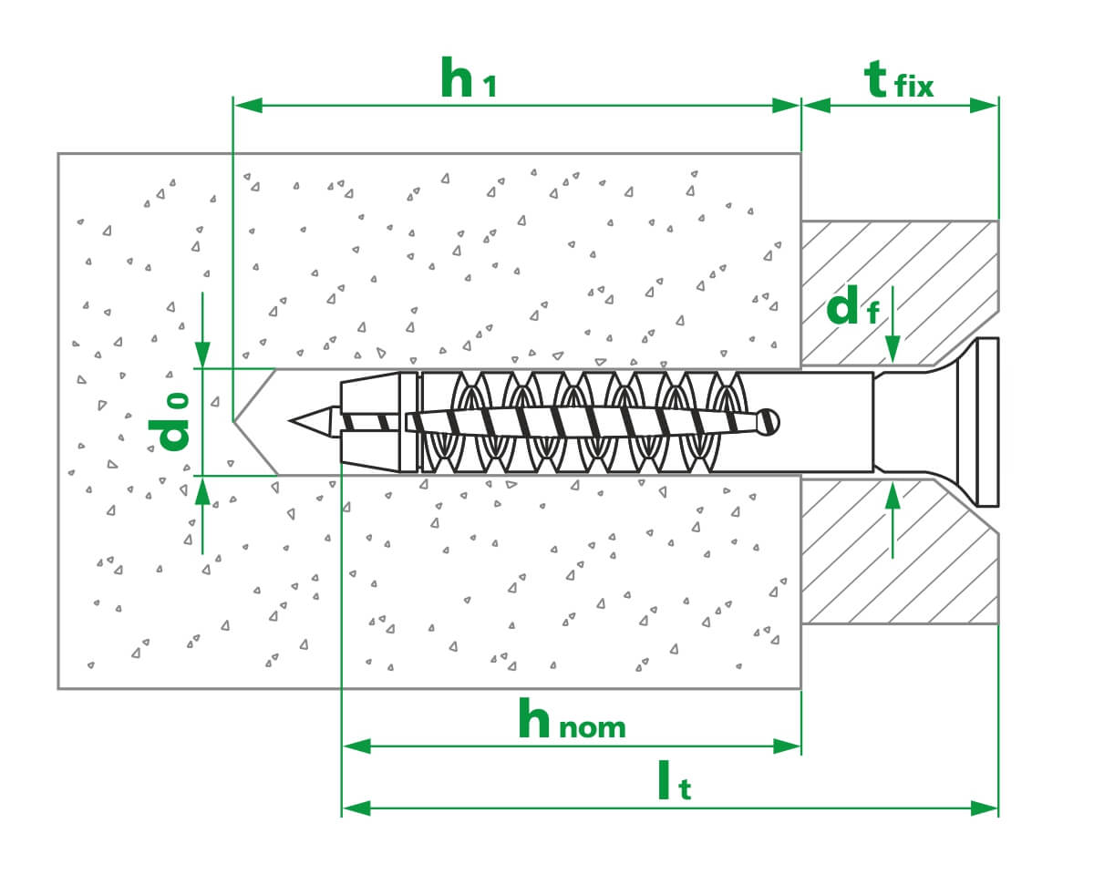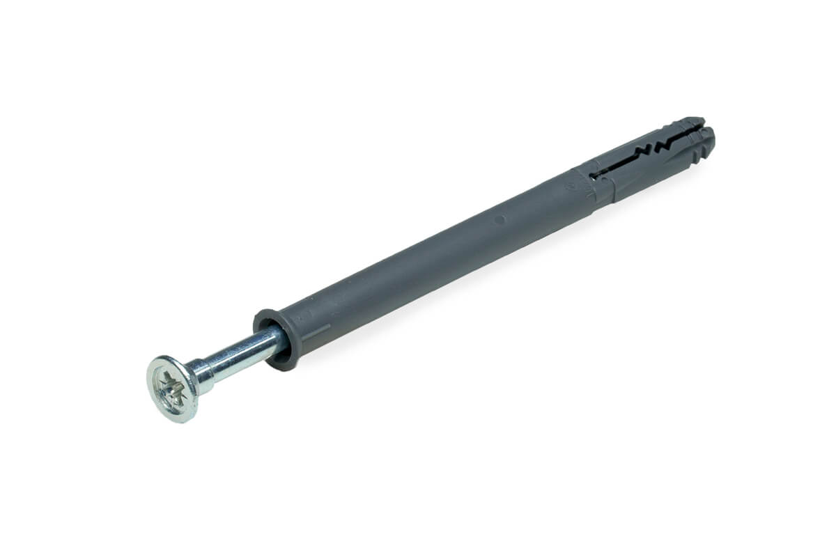Гвоздевой дюбель используется для сквозного монтажа оконных рам, дверных коробок, реек, карнизов к бетону, строительному камню, полнотелому кирпичу и др.Материалы: распорный дюбель - полипропилен, гвоздь - оцинкованная сталь.Особенности конструкции: система состоит из распорного дюбеля и гвоздя с винтовой нарезкой. Дюбель имеет предохранитель, препятствующий преждевременному распиранию при забивании гвоздя, а также обратную резьбу в хвостовой части, не позволяющую вывинчиваться дюбелю вместе с гвоздем. Потайной бортик дюбеля позволяет производить монтаж заподлицо в закрепляемой детали. Распорная часть дюбеля состоит из двух сегментов. На шляпке гвоздя крестовой шлиц, позволяющий осуществлять демонтаж или юстировку конструкции.Принцип работы: при забивании гвоздя дюбель равномерно распирается в стенках отверстия. Монтаж:- Просверлить отверстие по размерам, указанным изготовителем и очистить его. - Установить дюбель с монтируемой деталью методом сквозного монтажа и ударом молотка забить в него гвоздь.- При работе с пористым камнем или пустотелыми блоками длину дюбеля выбирают таким образом, чтобы зона распирания дюбеля попадала хотя бы в одну из перемычек строительного материала.- При необходимости затянуть крепежный элемент до упора с помощью отвертки или шуруповерта.